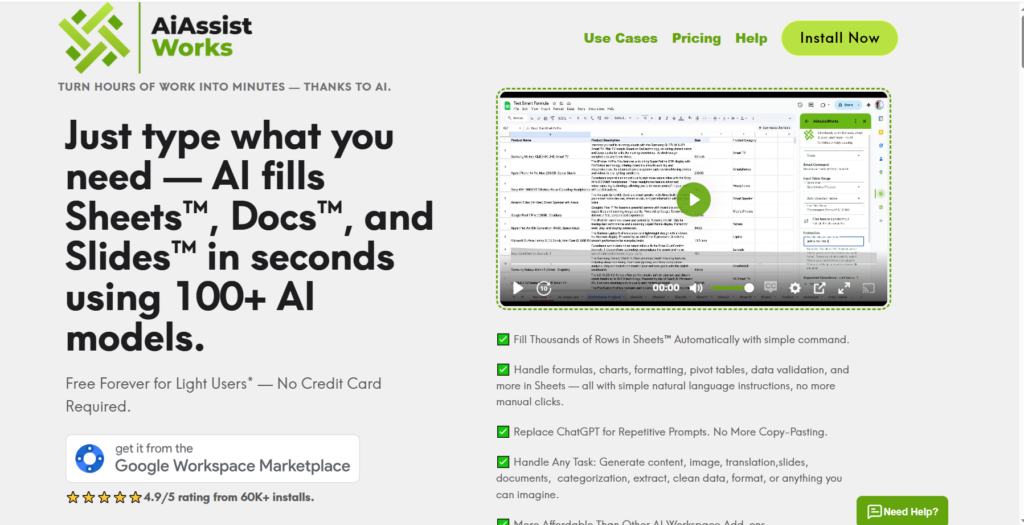 Une extension Google Workspace tout-en-un qui automatise les tâches complexes dans Sheets, Docs et Slides en utilisant plus de 100 modèles d'IA sans nécessiter de formules ou de scripts.