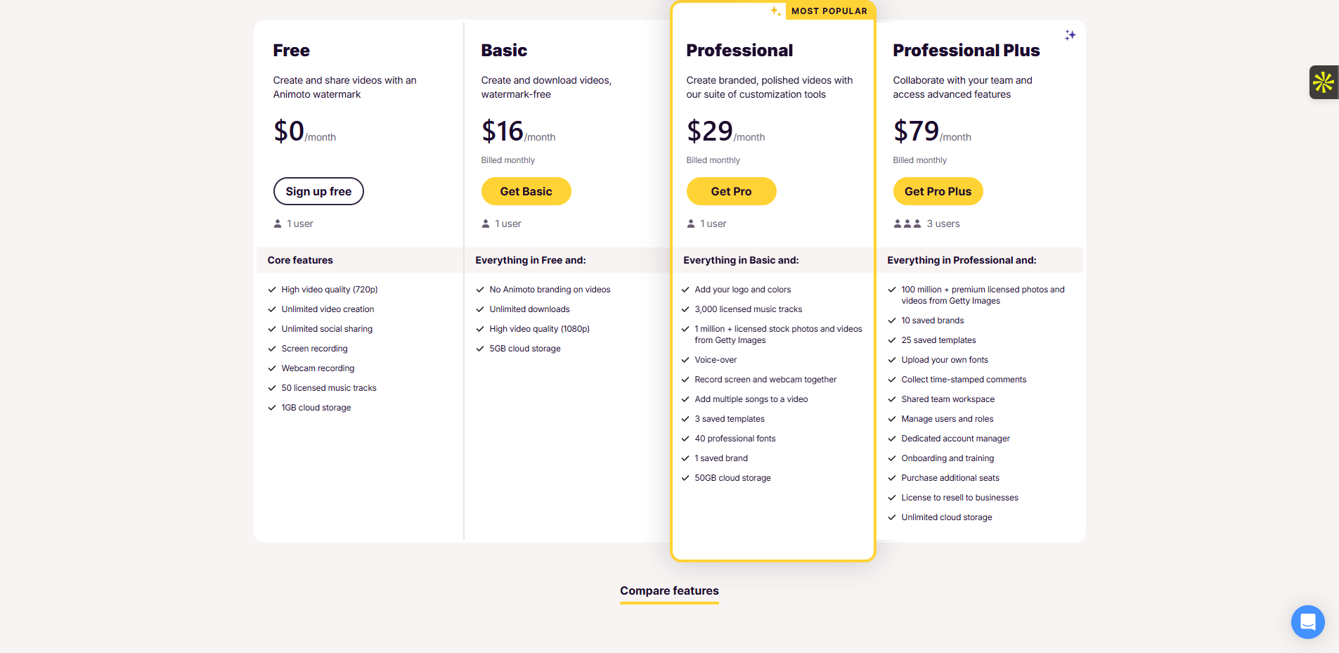 La politique tarifaire d’Animoto s’appuie sur trois offres : Free (limitée), Basic à 16 euros/mois et Professional à 29 euros/mois. Il existe aussi une version Team (49 euros/mois) pour trois utilisateurs. La version Free permet de tester l’interface mais reste marquée par le watermark Animoto.