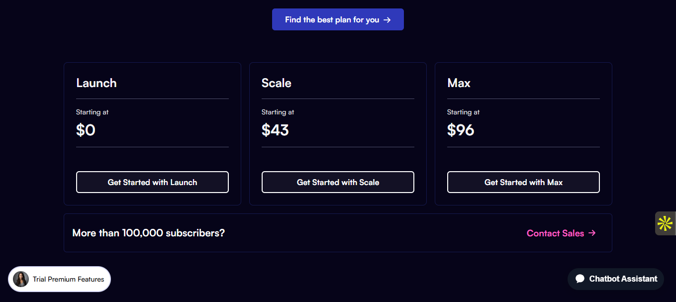 Beehiiv propose une tarification simple en trois plans : Gratuit (jusqu’à 2 500 abonnés), Grow à 49 dollars/mois (jusqu’à 10 000 abonnés), et Scale à 99 dollars/mois. Des tarifs très compétitifs comparés à ConvertKit ou Mailchimp, où des seuils similaires coûtent plus du double. Son plan gratuit est particulièrement généreux, avec la possibilité de publier, monétiser et acquérir sans limite temporelle. En revanche, les fonctions très avancées (custom domain, AB testing, analytics enrichis) sont réservées aux plans payants.