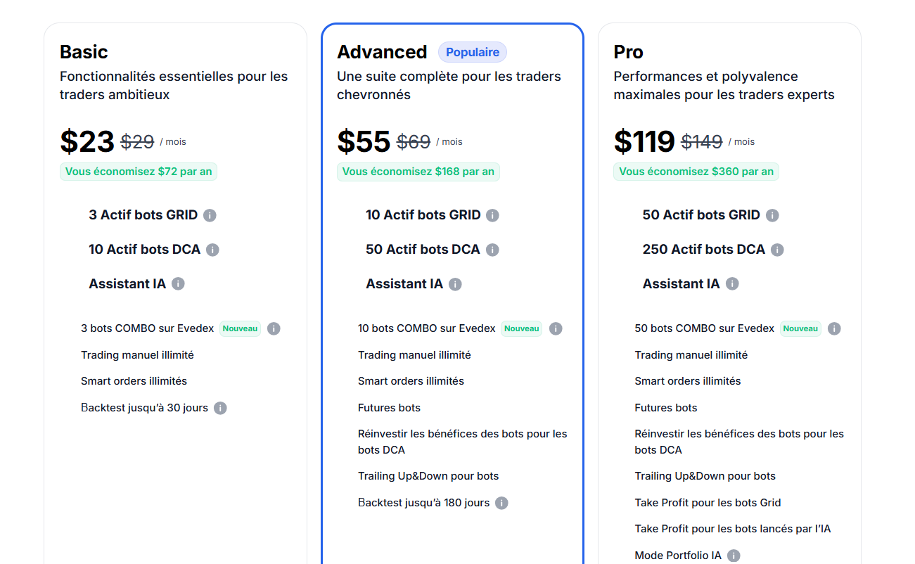 La tarification de Bitsgap repose sur plusieurs abonnements mensuels, avec des niveaux de fonctionnalites croissants. Lors de notre evaluation, nous avons observe que les plans commencent a un tarif accessible et montent progressivement pour debloquer plus de bots et de strategies avancees. Le positionnement prix est coherent face a des concurrents comme 3Commas ou Cryptohopper, souvent proposes dans des fourchettes similaires en euros lorsqu’on compare les offres equivalentes. Bitsgap inclut un essai gratuit, ce qui permet de tester sans risque. Aucun frais cache n’est facture par la plateforme, mais il faut anticiper les frais de trading des exchanges connectes. En termes de ROI, un utilisateur actif peut rapidement rentabiliser l’abonnement si les strategies sont bien parametrees. Comparativement, 3Commas offre plus d’options communautaires, tandis que Cryptohopper mise sur le marketplace de strategies. Bitsgap se distingue par son equilibre entre simplicite et puissance, ce qui justifie son prix pour un usage regulier.