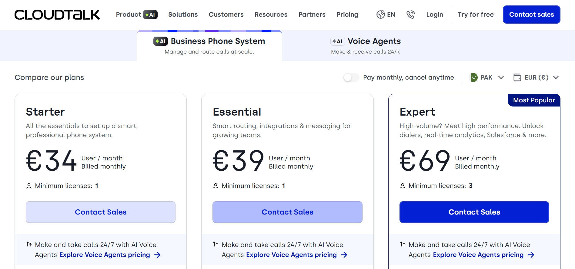 CloudTalk propose une tarification transparente, avec 4 plans principaux : Starter (25 euros/utilisateur/mois), Essential (30 euros), Expert (50 euros) et une offre Custom pour les grands comptes. Chaque niveau débloque des fonctionnalités supplémentaires comme le routage intelligent, les statistiques détaillées ou les enregistrements illimités.