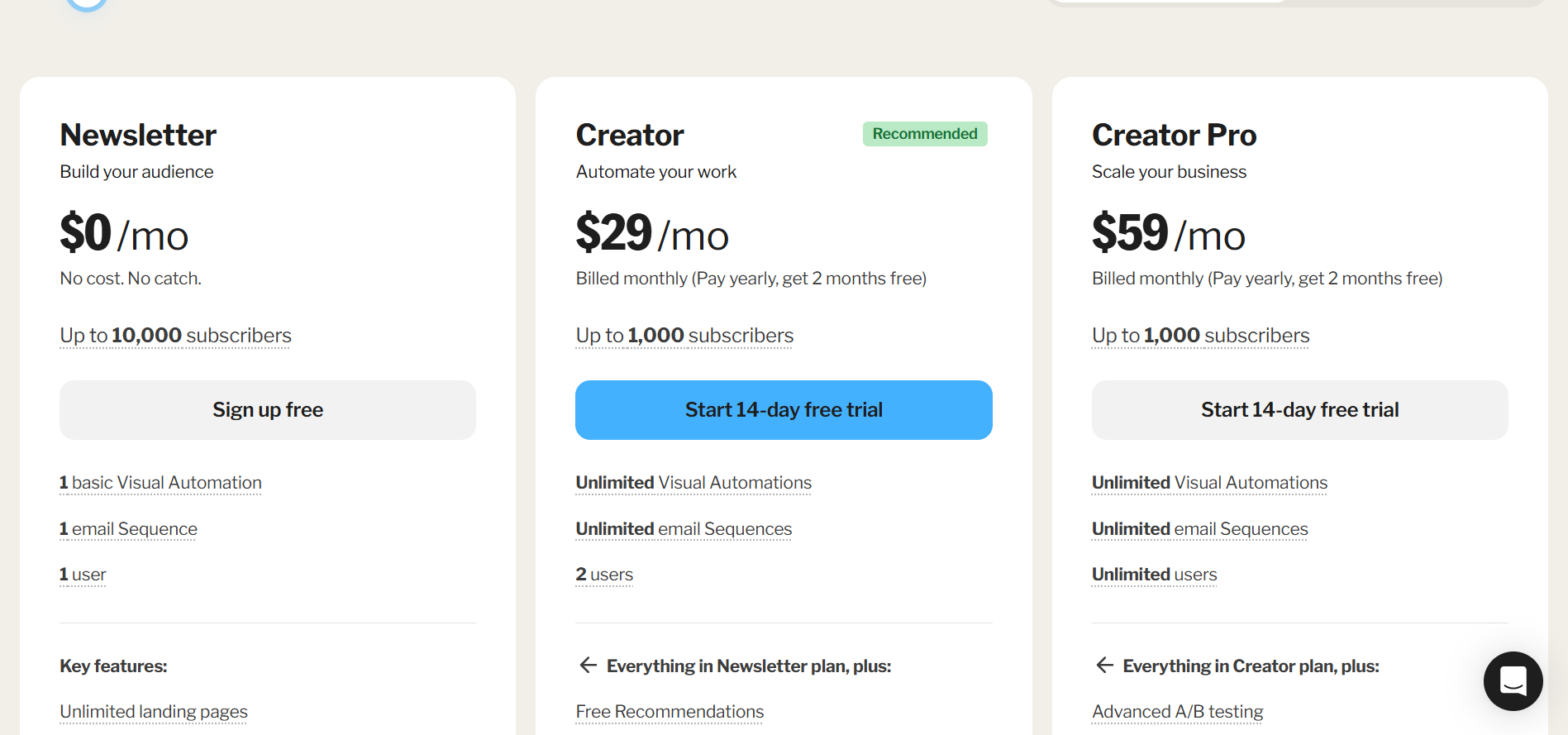 Le pricing ConvertKit commence à 0 euro jusqu’à 1 000 abonnés, avec quelques limitations comme l’absence d’automatisations avancées. Ensuite, le plan Creator débute à 15 euros/mois (facturé annuellement) pour 300 abonnés, puis évolue jusqu’à plusieurs centaines d’euros pour des listes importantes.