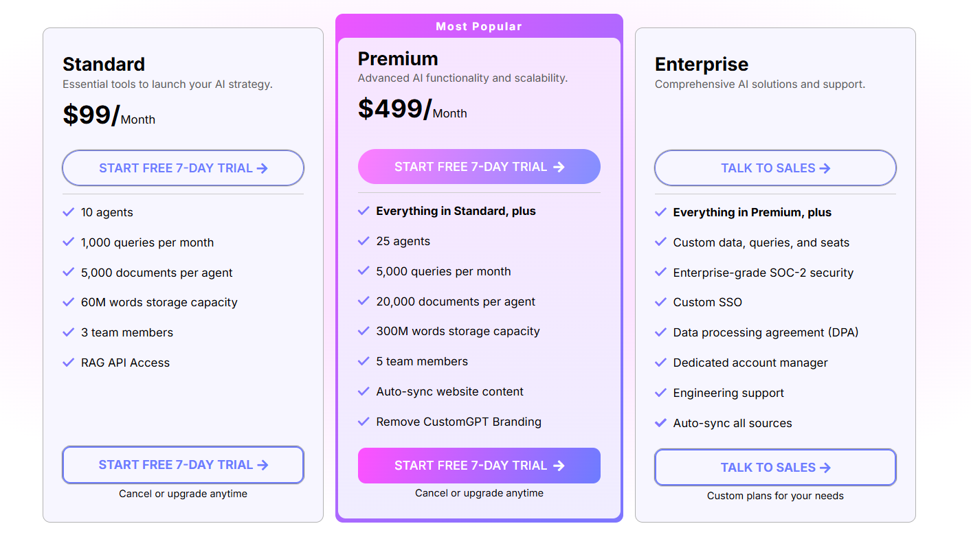 CustomGPT propose des plans débutant à environ 99 $ par mois pour les besoins standards. Les tarifs évoluent en fonction du nombre d’agents, du volume de requêtes et de la capacité de stockage des mots, avec des options « Premium » pour le retrait du branding et des fonctionnalités avancées.