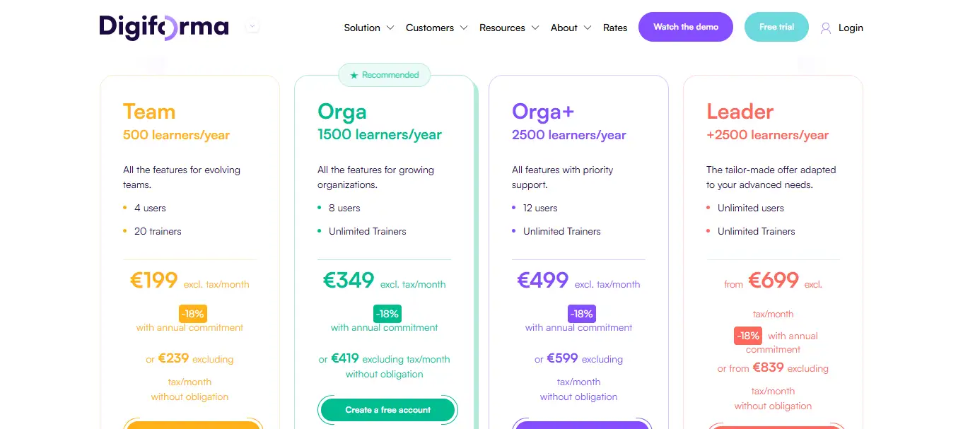 Digiforma propose une tarification par niveau d’abonnement mensuel, sans engagement. L’offre débute à 49 euros/mois pour les indépendants avec accès à toutes les fonctions principales. Les tarifs évoluent ensuite à 89 euros/mois (offre PRO) et jusqu’à 159 euros/mois pour la version Business, incluant plus d’automatisations, gestion des équipes et connecteurs comptables.