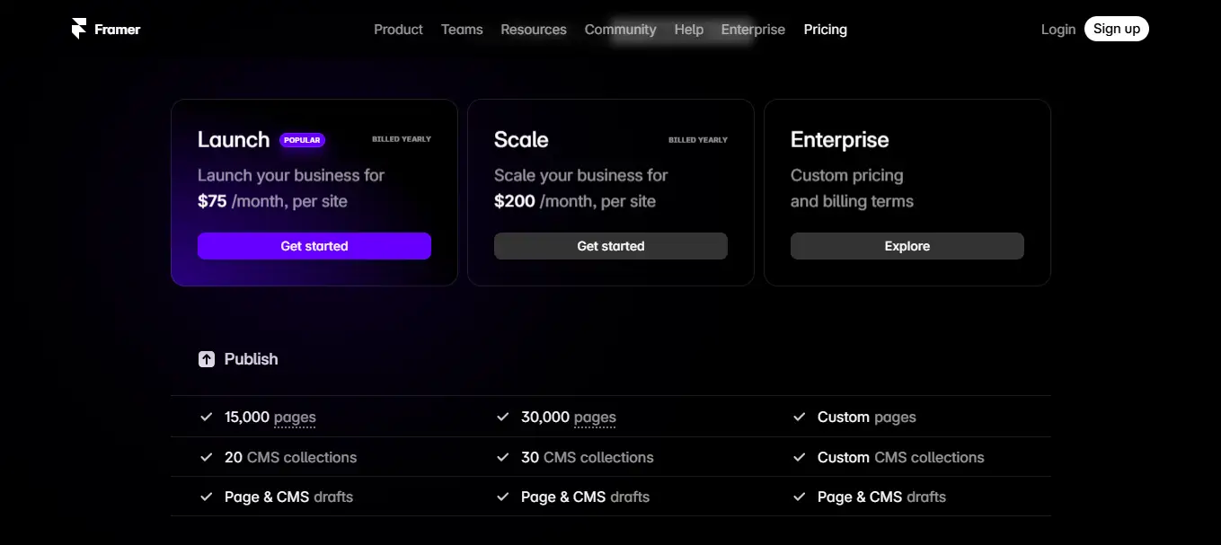Framer propose un modèle freemium avec une grille tarifaire progressive. Le plan gratuit permet de créer jusqu’à 3 projets publics, sans fonctionnalités CMS. Le plan ‘Mini’ coûte 5 euros/mois et permet un seul site live avec nom de domaine personnalisé. Le plan ‘Basic’ à 15 euros/mois introduit des fonctionnalités CMS et meilleures options de SEO. Le plan ‘Pro’, à 30 euros/mois, est le plus populaire : CMS complet, collaborations illimitées, tracking, etc. En entreprise, un plan sur mesure ‘Enterprise’ ajoute support dédié et sécurité renforcée.