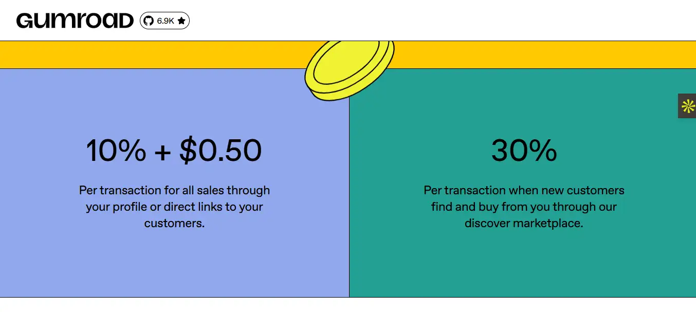Le modèle tarifaire de Gumroad est à la fois clair et original : pas d’abonnement fixe, uniquement une commission de 10% sur chaque vente. Ce fonctionnement convient parfaitement aux créateurs débutants qui ne génèrent pas encore de volume régulier. Il n’y a donc aucun coût fixe, ce qui le rend plus accessible que des solutions comme Podia ou Sellfy.