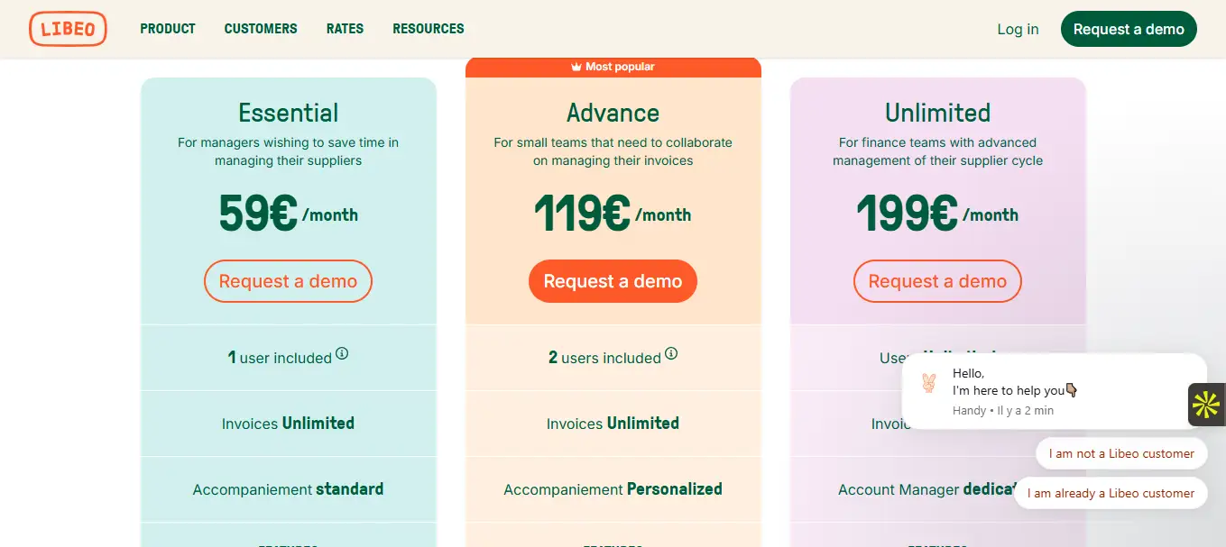 La tarification de Libeo est structurée en 3 plans : Essentiel à 49 euros/mois, Growth à 149 euros/mois et un pack personnalisé Enterprise. Le plan Essentiel permet un premier niveau d’automatisation (jusqu’à 30 factures traitées/mois), mais reste limité sur la collaboration d’équipe. Le plan Growth est adapté aux entreprises avec un certain volume de factures et offre notamment les circuits de validation et les rôles utilisateurs.