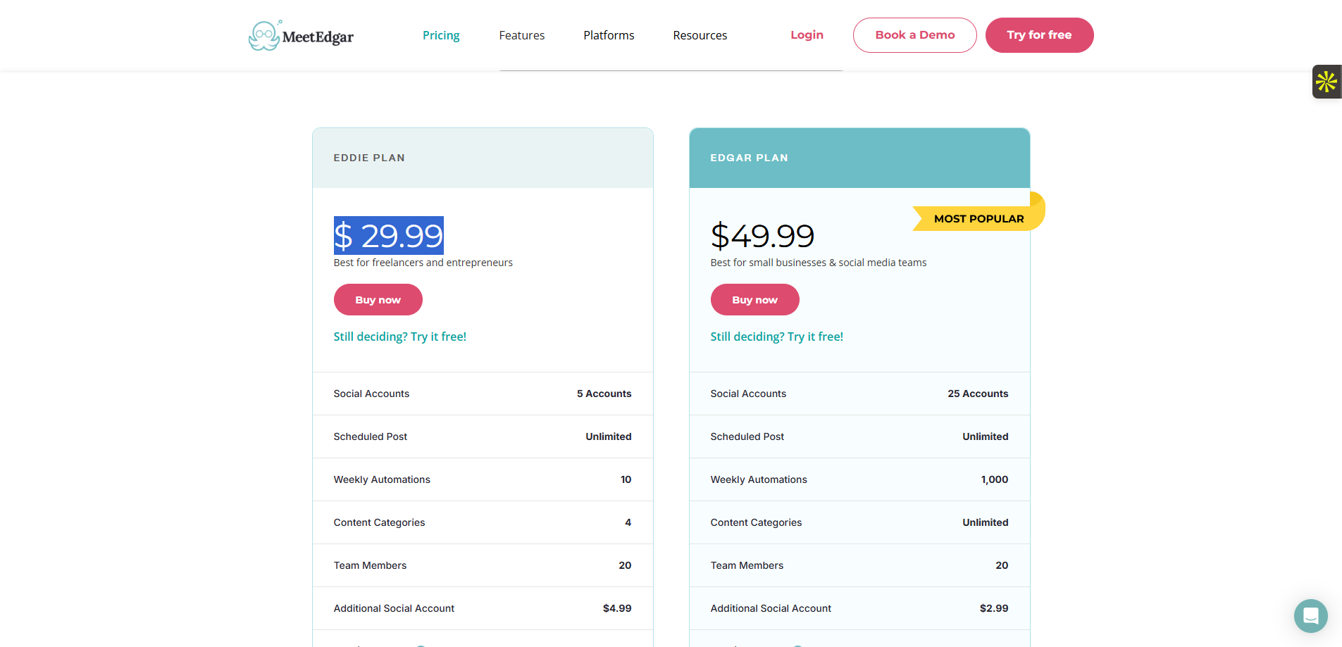 MeetEdgar propose deux plans tarifaires simples : Edgar Lite à 29,99 dollars/mois (5 comptes sociaux), et Edgar à 49,99 dollars/mois (25 comptes sociaux). Chaque plan inclut l’ensemble des fonctionnalités, y compris la bibliothèque, le recyclage intelligent et l’importation automatique. À ce prix, MeetEdgar se positionne légèrement plus cher que Buffer (à partir de 6 dollars/mois par canal) mais moins cher que Hootsuite (à partir de 99 euros/mois pour 1 utilisateur). Il ne facture pas à l’utilisateur supplémentaire, ce qui peut séduire les solopreneurs. Aucun plan gratuit n’est proposé, mais un essai de 7 jours permet de tester toutes les fonctions. En termes de ROI, si votre production de contenu est régulière et que vous perdez du temps à republier manuellement, le gain de temps justifie largement l’abonnement.