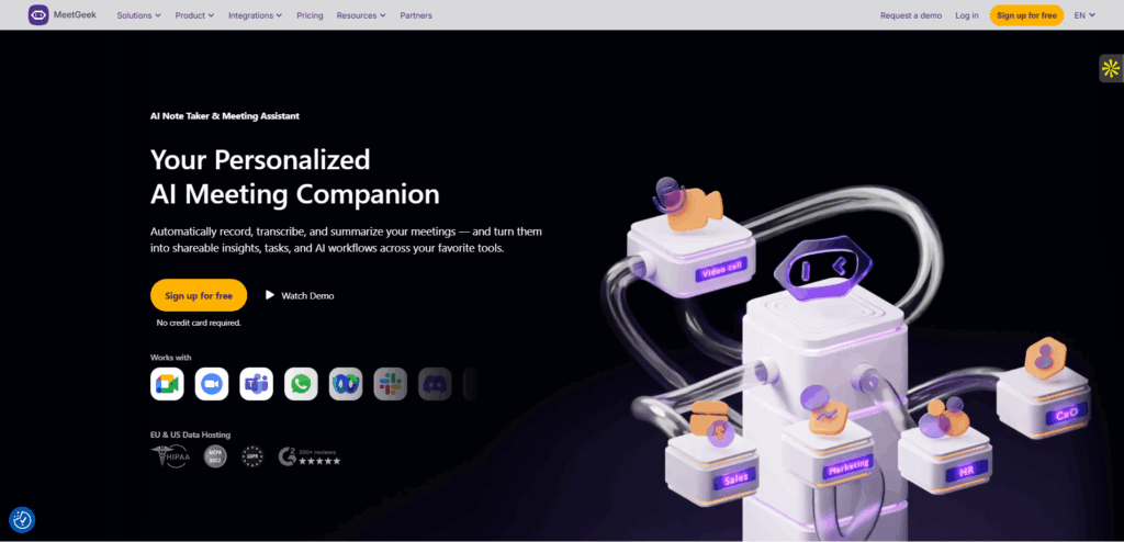 MeetGeek est un assistant IA conçu pour automatiser, transcrire et analyser les réunions vidéo. Édité par MeetGeek SRL, la plateforme s’adresse aux professionnels en quête d’efficacité dans la gestion de leurs échanges. Son objectif : éviter les prises de notes manuelles et créer des comptes-rendus automatiques exploitables. Le marché visé est vaste : de la startup agile à l’entreprise structurée. MeetGeek se connecte à Zoom, Google Meet, Microsoft Teams pour rejoindre automatiquement les réunions et y faire son travail.