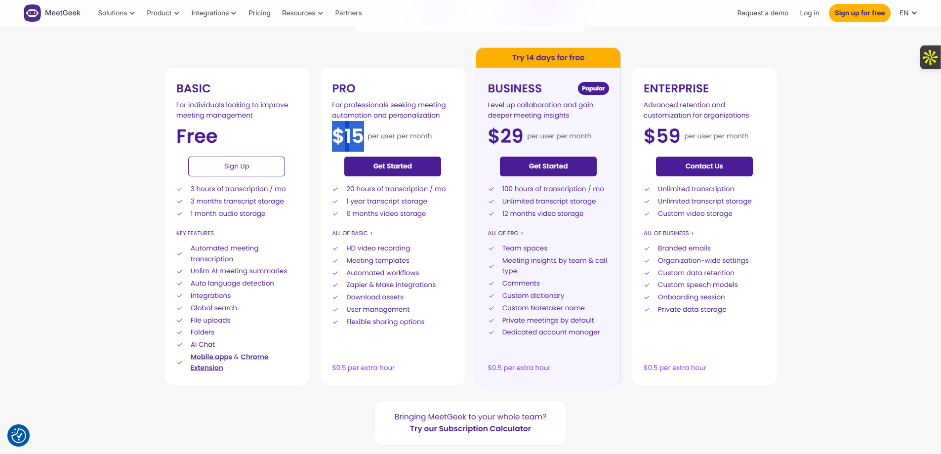 La grille tarifaire de MeetGeek est compétitive et tranche avec des offres concurrentes comme Otter.ai ou Fireflies.ai. La version gratuite permet de tester les principales fonctionnalités avec 5 réunions enregistrables par mois. Ensuite, les plans payants démarrent à 15 dollars/mois pour le plan Pro individuel, et montent à 29 dollars/mois pour le plan Business intégrant plusieurs utilisateurs. Des remises sont appliquées en paiement annuel. Pour les équipes plus larges, le plan Enterprise est personnalisable. Comparé à Fireflies.ai qui commence à 18 dollars/mois sans plan gratuit, MeetGeek offre un bon point d’entrée. Le ROI devient très intéressant dès 3–4 réunions par semaine, car les taux d’utilisation et de réexploitation des contenus générés sont élevés. Aucun coût caché identifié, mais attention aux limites temporelles des réunions dans les formules gratuites.
