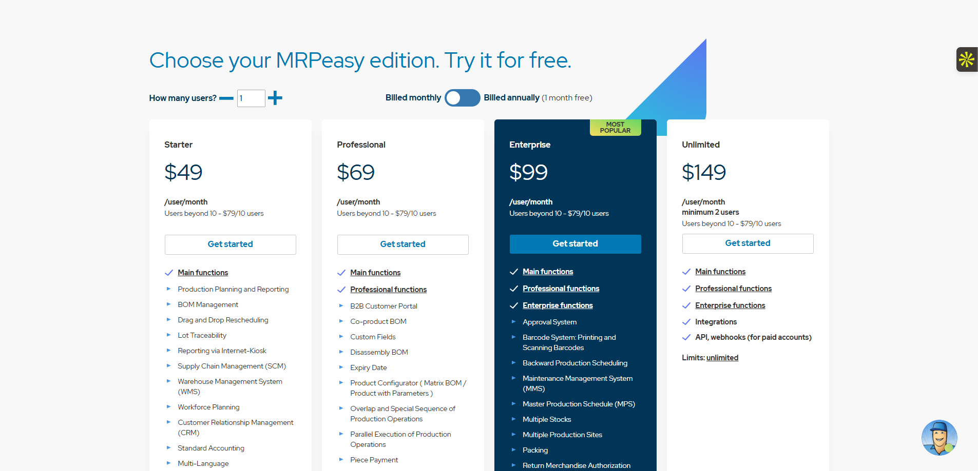 MRPeasy adopte une tarification modulaire par utilisateur, avec 4 plans allant de 49 à 99 euros/mois par utilisateur. Le plan ‘Starter’ (49 euros) couvre les fonctions de base (stock, production simplifiée), mais les fonctionnalités avancées (MRP II, CRM, qualité ou API) requièrent les plans ‘Professional’ (69 euros) ou ‘Enterprise’ (99 euros). Pour une PME de 10 utilisateurs, le budget annuel grimpe rapidement autour de 10 000 euros.