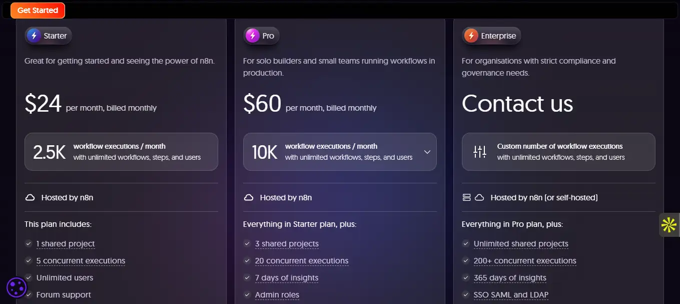n8n propose deux modèles : cloud (SaaS) et self-hosted (open-source). L’offre Cloud démarre avec une formule gratuite jusqu’à 500 exécutables/mois, idéale pour tester ou lancer un MVP. Le plan Pro à 20 euros/mois comprend 10 000 exécutions et utilisateurs multiples. Le mode self-hosted est quant à lui complètement gratuit, sauf si vous avez besoin de fonctionnalités avancées payantes ou de support professionnel.
