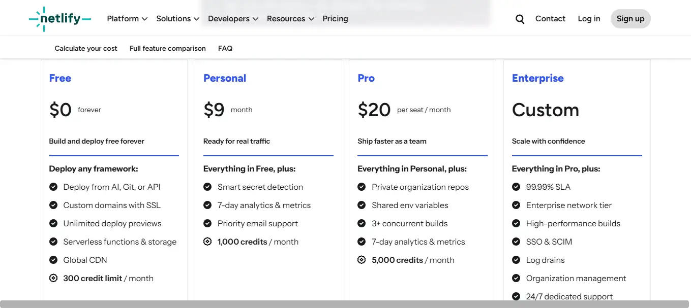 La grille tarifaire de Netlify est simple : un plan 100% gratuit pour projets personnels ou MVP, permettant jusqu’à 300 build minutes/mois. Le plan Pro à 19 dollars/mois (env. 17,5 euros) débloque jusqu’à 1000 build minutes, la gestion des membres et le support prioritaire. Le plan Business à 99 dollars/mois (env. 91 euros) ajoute les rôles avancés, le SSO, et des builds encore plus rapides.