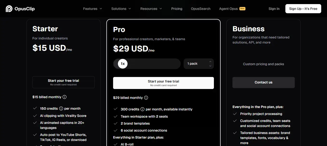 Opus propose plusieurs plans tarifaires incluant une version gratuite avec 60 minutes de traitement par mois, très utile pour tester. Le plan Creator à 19 euros/mois donne accès à 200 minutes, tandis que le plan Pro à 59 euros/mois inclut 600 minutes et des fonctionnalités avancées comme l’export sans watermark et l’accès anticipé aux features beta. Un plan Enterprise est disponible sur devis, pour un volume plus important.