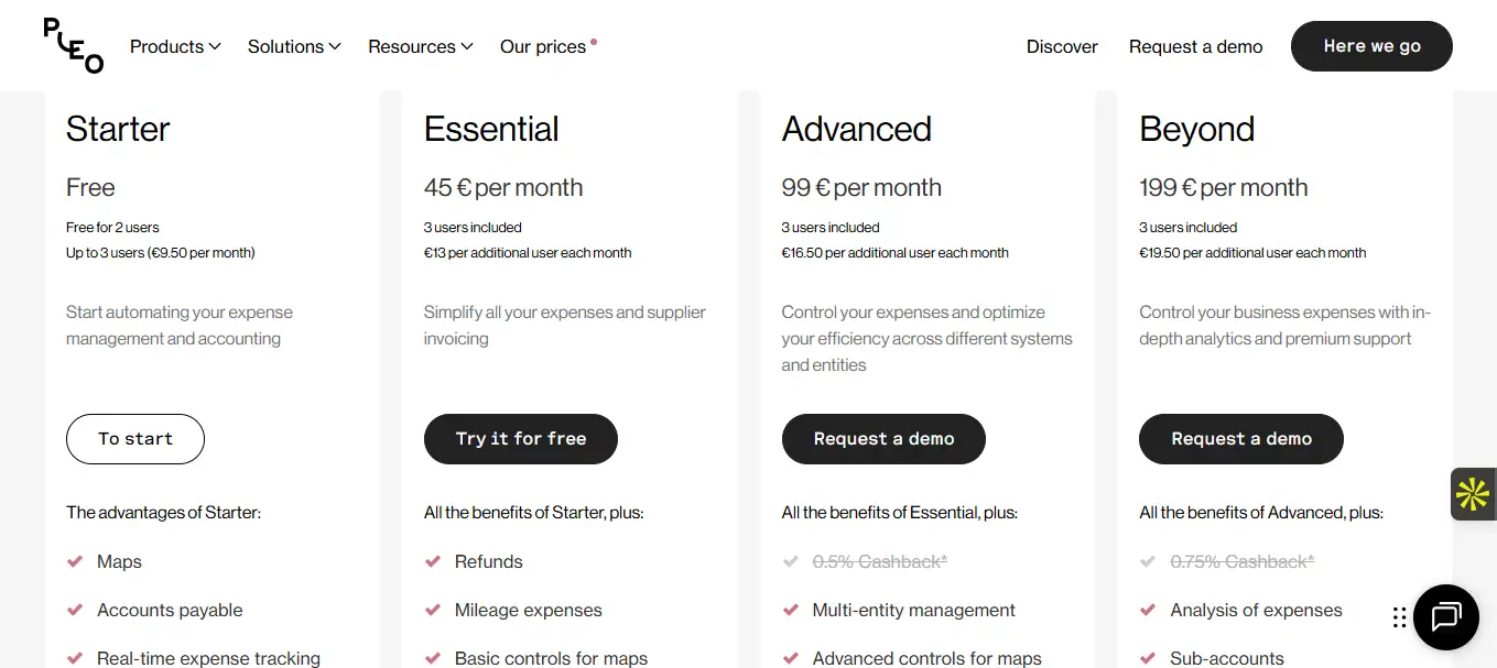Pleo propose une tarification claire articulée autour de trois formules : Essentiel (gratuit pour 3 utilisateurs), Avancé (39 euros/mois + 8 euros par utilisateur) et Premium (tarif sur devis). La formule gratuite est idéale pour tester l’outil ou une petite équipe finance. Le plan Avancé apporte des fonctionnalités comme les exportations comptables, les intégrations plus poussées, et un support prioritaire.