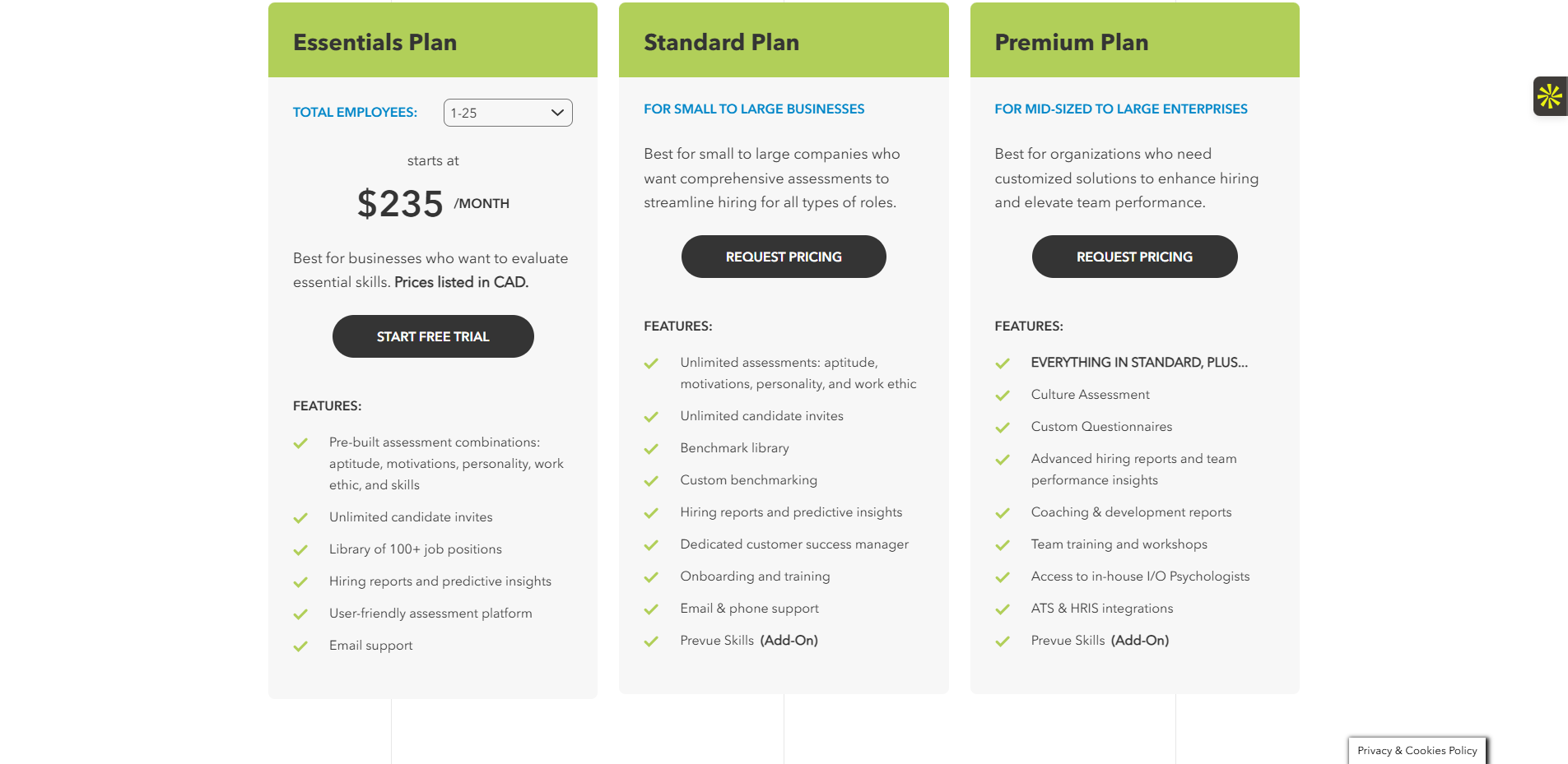 Sur sa page ‘Pricing’, Prevue ne communique pas de tarifs publics standards. Une tarification personnalisée est appliquée selon la taille de l’entreprise et la volumétrie de recrutement. Toutefois, plusieurs sources clients indiquent un modèle basé sur un abonnement annuel avec volume de crédits (évaluations). À titre comparatif, son coût se situe dans la même gamme que des solutions comme Criteria Corp ou The Predictive Index.
