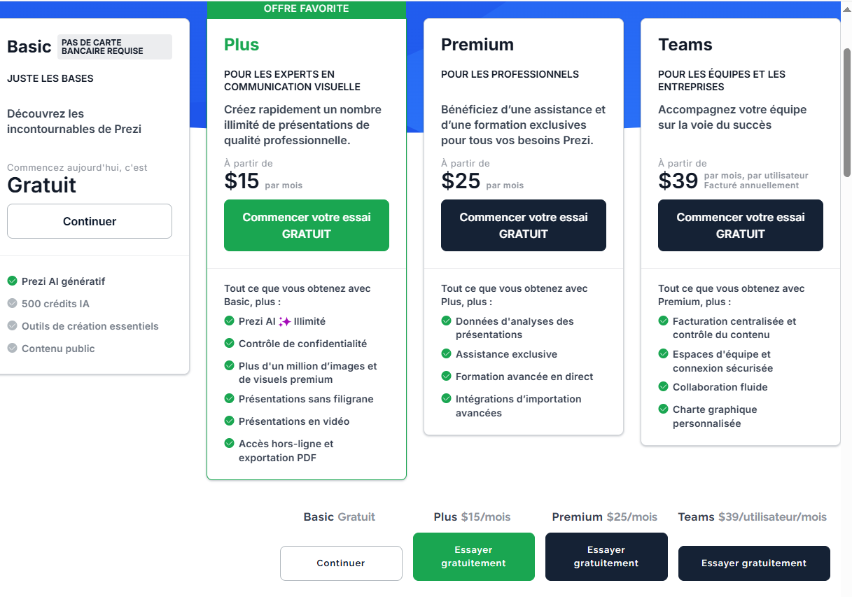 Prezi propose une tarification par abonnement avec plusieurs offres selon les usages. Les plans individuels démarrent autour de 10 euros par mois pour les fonctionnalités de base, tandis que les versions Plus et Premium augmentent selon les options avancées et le stockage. Les offres Business sont plus élevées mais intègrent la collaboration avancée et des outils dédiés aux équipes.