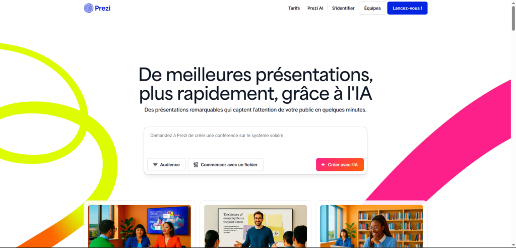 Lors de notre test Prezi, nous avons constaté une réelle volonté de simplifier la prise en main, tout en conservant une grande liberté créative. Le marché visé est clairement celui des alternatives avancées à PowerPoint, avec un positionnement premium orienté impact visuel et storytelling. Prezi se distingue par son identité graphique forte et par une promesse simple : rendre chaque présentation plus vivante et plus convaincante.