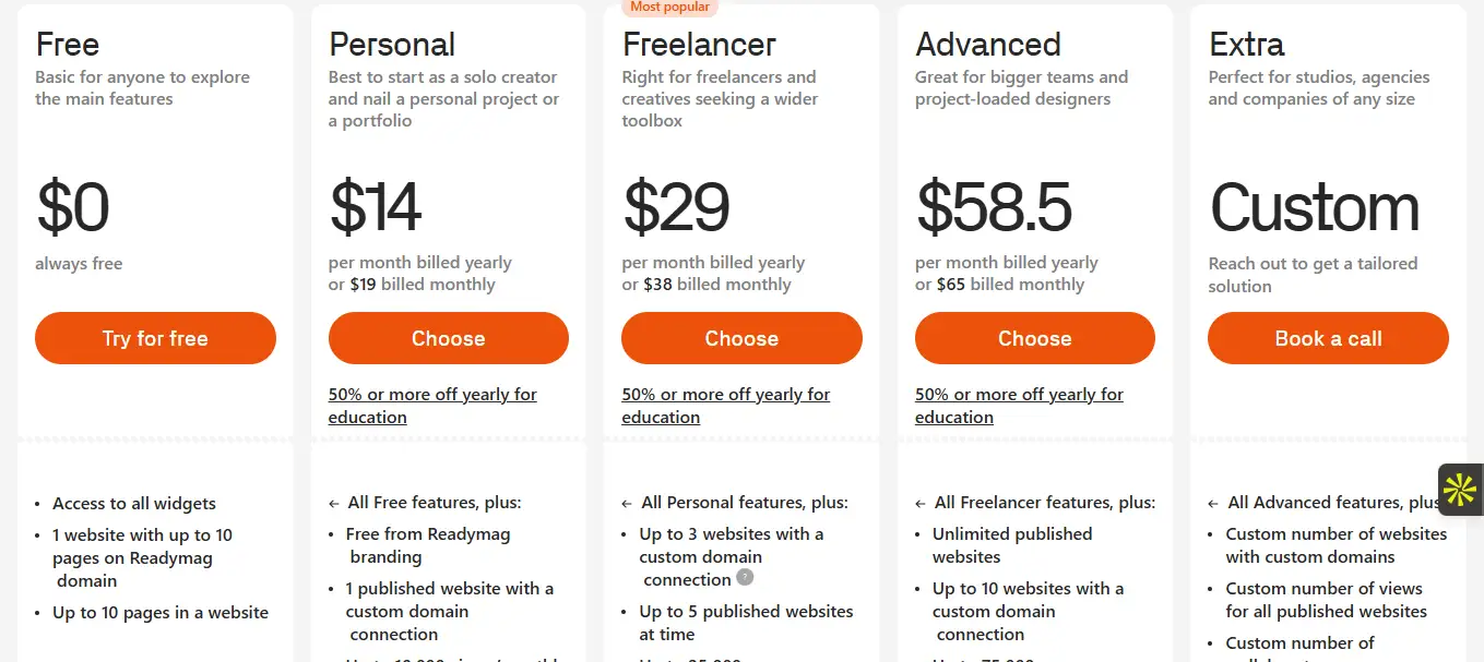 Readymag propose une tarification en quatre formules : Free, Personal (20 dollars/mois), Studio (25 dollars/mois/utilisateur) et Business (40 dollars/mois/utilisateur). Le plan gratuit est utile pour tester mais reste très limité (1 projet, domaine Readymag). Le plan Personal convient bien aux freelances désirant monter leur portfolio visible publiquement. Le plan Studio est adapté pour une petite équipe ou agence avec plusieurs utilisateurs. À titre de comparaison, Webflow propose une formule gratuite mais les plans Pro montent vite à 35-42 dollars/mois. Squarespace, plus orienté grand public, facturera entre 16 et 49 dollars/mois. Le ROI est bon si la priorité est la créativité, mais Readymag reste cher dès lors que l’on souhaite publier plusieurs projets complets, avec hébergement personnalisé. Pas de frais cachés notables, mais l’hébergement externe reste à la charge de l’utilisateur pour les exports HTML.