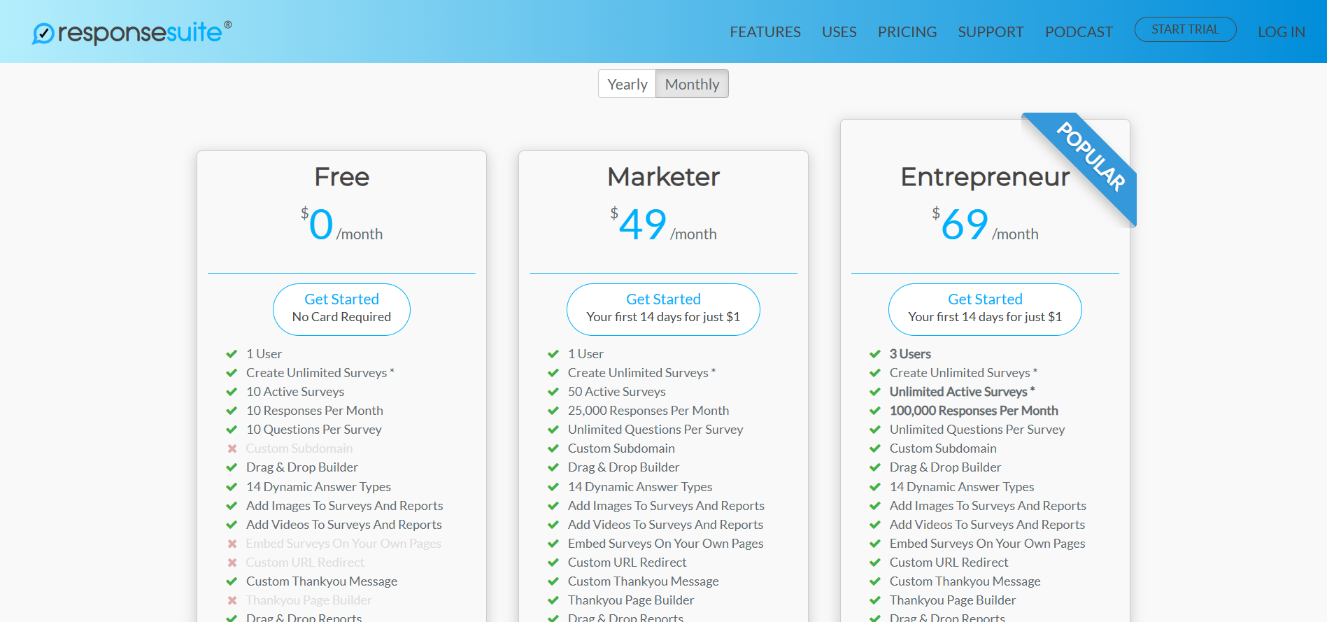 ResponseSuite propose trois plans tarifaires : Basic à 47 dollars mensuels, Pro à 67 dollars et Enterprise à 197 dollars. Chaque niveau débloque plus de sondages actifs, de connexions CRM et d’automatisations. Face à des concurrents comme Outgrow ou Typeform (qui facturent dès 25-35 euros), ResponseSuite se positionne plus comme outil marketing avancé que simple générateur de formulaires. La tarification peut sembler élevée, mais le ROI devient pertinent dans un contexte de lead nurturing ou de segmentation active. Aucun frais caché, mais attention : le plan Basic ne permet pas les redirections conditionnelles et limite les intégrations.
