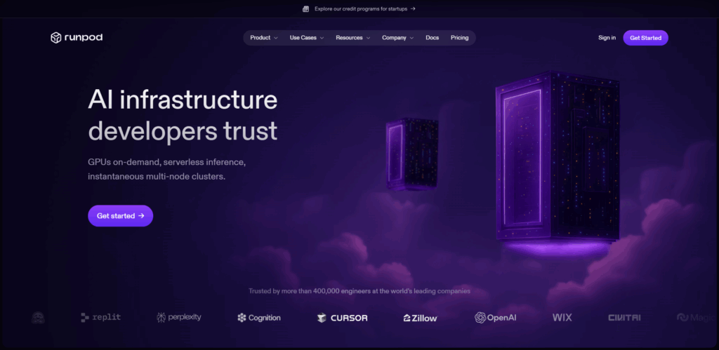 Accessible directement depuis un navigateur, RunPod permet de lancer des environnements GPU en quelques minutes, en choisissant son framework (comme PyTorch ou TensorFlow) et ses ressources. Ce positionnement ‘GPU-only’ en mode serverless ou persisté en fait une alternative économique, rapide et simple à déployer dans des contextes critiques.