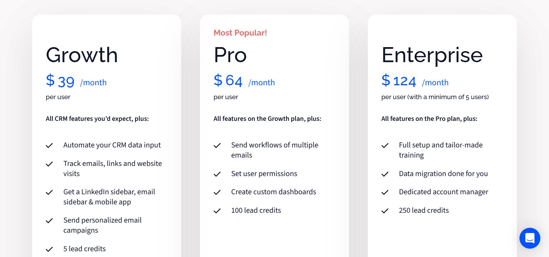 La tarification de Salesflare est simple et compétitive. Trois plans sont proposés : Growth (29 euros/mois/utilisateur), Pro (49 euros) et Enterprise (99 euros), facturés annuellement. La formule Pro est celle que nous recommandons pour bénéficier des séquences d’e-mails et de meilleurs outils collaboration.