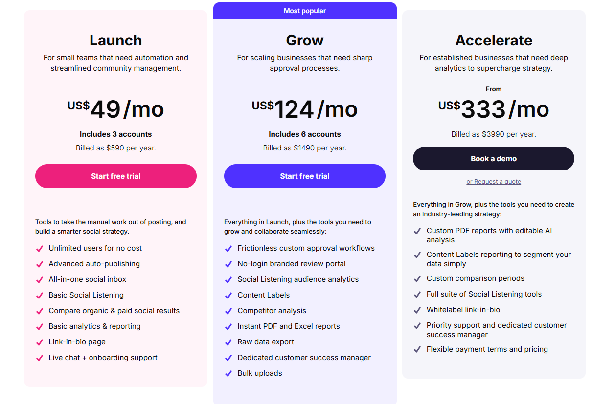 La tarification de Sked Social se situe clairement dans le segment professionnel. Les abonnements débutent généralement autour de plusieurs dizaines d’euros par mois, selon le nombre de comptes et d’utilisateurs. Ce positionnement tarifaire est comparable à Hootsuite et Sprout Social, mais plus élevé que Buffer sur les offres d’entrée de gamme. Lors de notre analyse, nous avons estimé que le ROI devient intéressant dès lors que l’on gère plusieurs comptes ou une équipe. Il n’y a pas de coûts cachés majeurs, mais certaines fonctionnalités avancées nécessitent des plans plus élevés. Sked Social assume un pricing premium justifié par la publication automatique et la stabilité. Pour des structures organisées, le gain de temps compense largement le coût. Pour des usages légers, d’autres outils plus abordables peuvent suffire.
