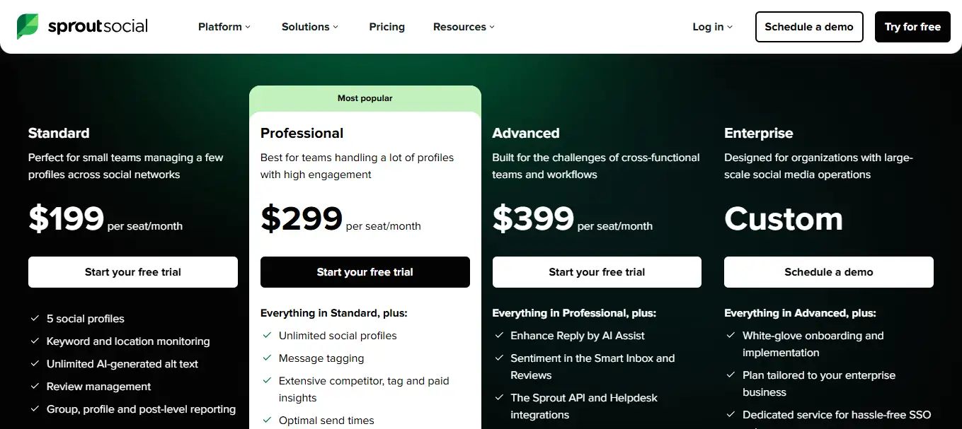 Sprout Social propose quatre offres tarifaires : Standard (249 dollars/mois), Professional (399 dollars/mois), Advanced (499 dollars/mois) et Enterprise (prix sur devis). Tous les plans incluent au minimum 5 profils sociaux, 1 utilisateur, et l’accès aux outils de planification et engagement. Le seuil d’entrée est élevé, surtout en comparaison avec Hootsuite (99 dollars pour des fonctionnalités comparables) ou Agorapulse (à partir de 69 euros/mois). Mais la profondeur fonctionnelle, la qualité du support et les capacités d’intégration API justifient pour beaucoup ce positionnement. Il faut également considérer les coûts inversés : gain de temps, meilleure performance sociale, réduction des outils additionnels. L’absence de plan accessible pour les indépendants reste, cependant, un frein notable pour les petits budgets. Une période d’essai gratuit de 30 jours est proposée, sans carte.