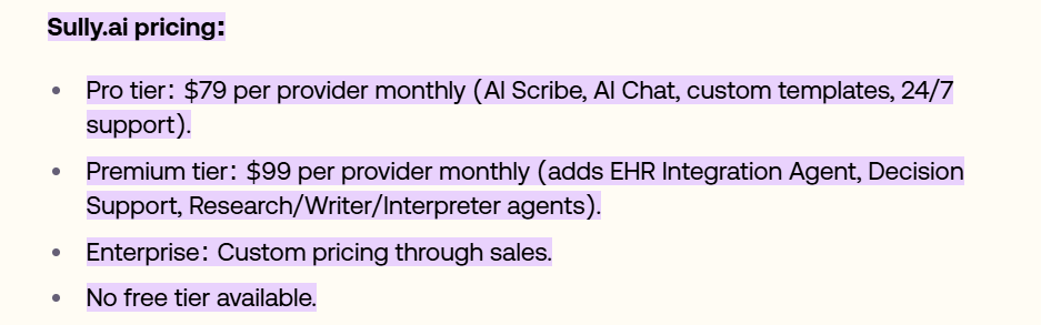 La tarification de Sully AI n est pas affichee de maniere totalement publique, ce qui suggere un modele sur devis adapte aux besoins. Ce positionnement est courant sur le marche des solutions de scribe medical. Compare a des concurrents comme Suki AI, DeepScribe ou Tali AI, Sully AI semble se placer dans une fourchette competitve pour les cabinets de petite a moyenne taille.