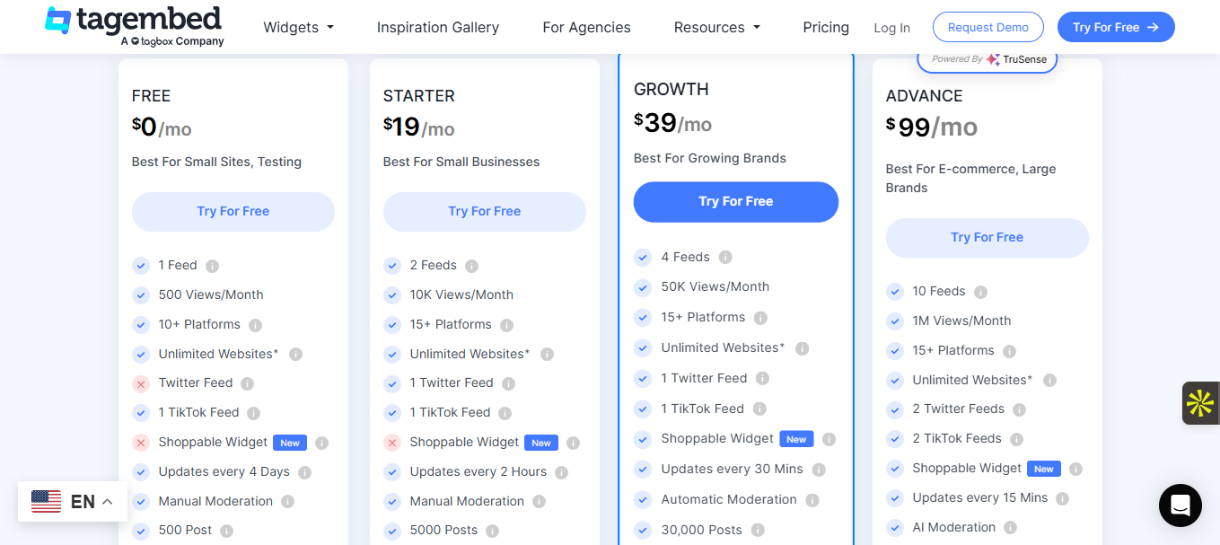 La tarification de Tagembed est découpée en 4 plans : Gratuit (1 feed, fonctionnalités basiques), Basic à 19 dollars/mois, Pro à 29 dollars/mois et Plus à 49 dollars/mois. Tous les plans sont mensuels ou annuels avec remises.