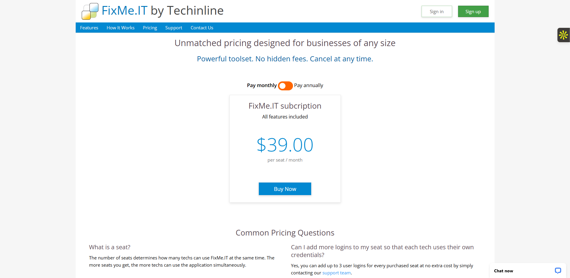 La tarification de FixMe.IT se veut simple, mais un peu rigide. Le plan standard à 30 dollars/mois par technicien (ou 300 dollars/an) donne accès à la totalité des fonctionnalités sans limitation de sessions ou d’utilisateurs distants. Il n’y a pas d’offre gratuite ni de plan en équipe avec tarification dégressive.