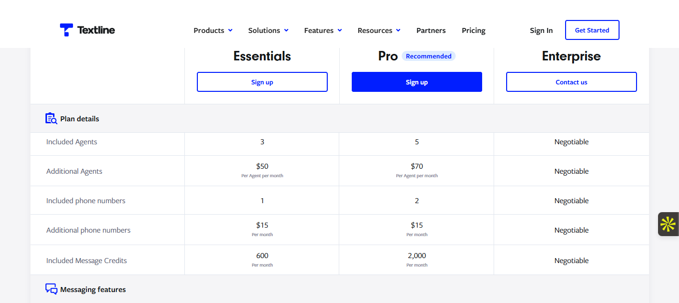 La grille tarifaire de Textline est simple mais s’adresse à des entreprises avec un usage quotidien du SMS professionnel. Le plan Starter débute à 59 dollars mensuels par utilisateur, avec les fonctions essentielles (messagerie, automatisation, analytics de base). Pour accéder au reporting avancé, aux intégrations CRM (Salesforce, HubSpot, etc.) et à davantage de contrôle, il faut opter pour le plan Pro à 89 dollars/mois/utilisateur.