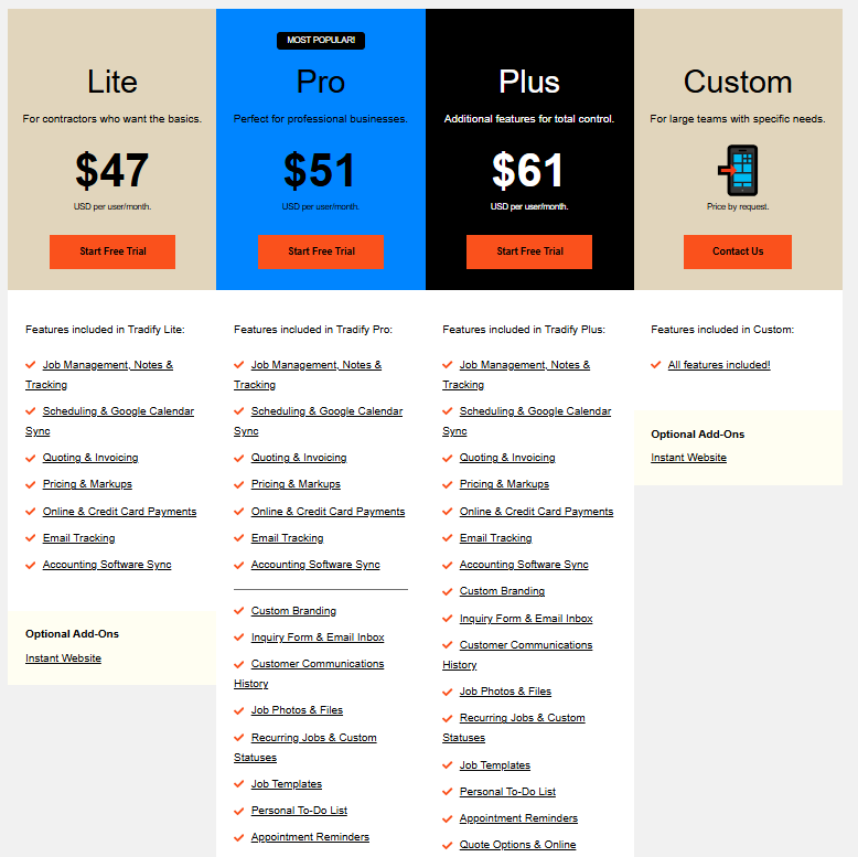 La tarification de Tradify repose sur un modele par abonnement mensuel par utilisateur, comme c est courant sur le marche SaaS. Les prix exacts evoluent selon les plans et les options choisies, avec un positionnement dans la moyenne du secteur. L investissement se justifie par le gain de temps administratif observe lors de notre test.