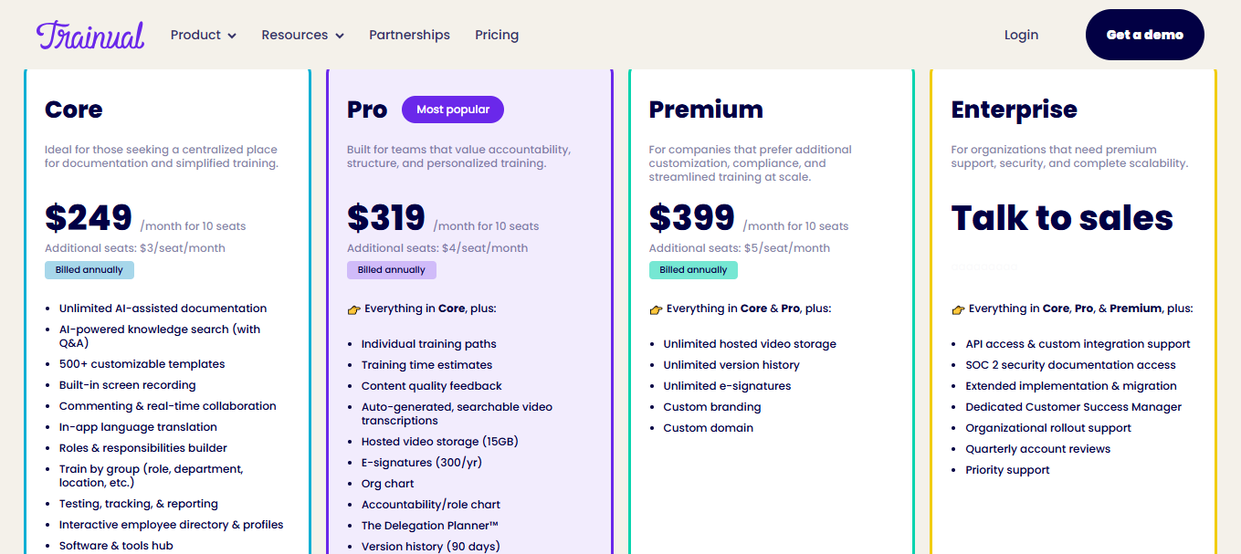Trainual propose une tarification en trois plans : Core à 300 dollars/mois, Pro à 600 dollars/mois et Premium sur devis. Ces plans incluent un nombre illimité d’utilisateurs mais varient en fonctionnalités : intégrations avancées, API, SCIM, support personnalisé…