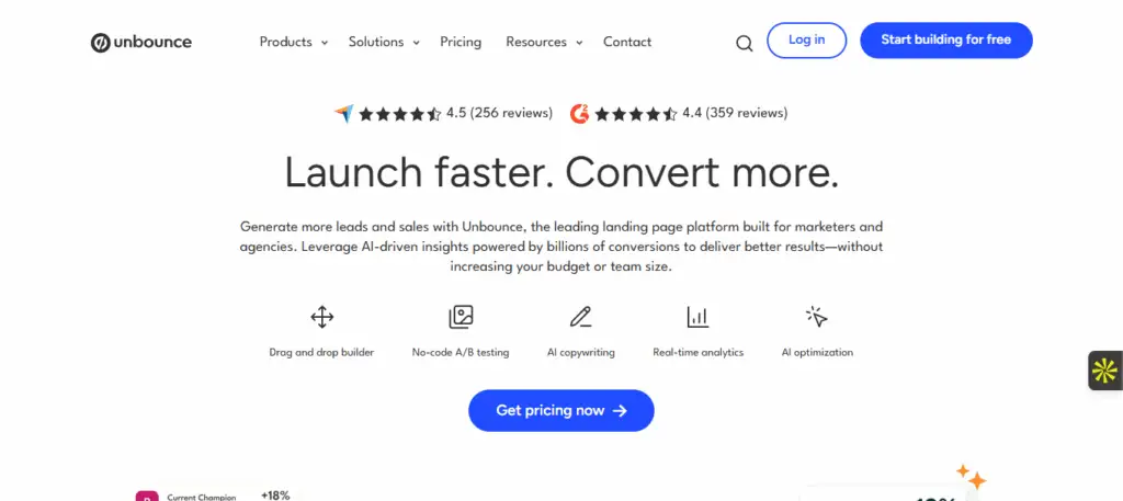 Sur les plateformes d’avis, Unbounce affiche une note G2 de 4.4/5 pour 350 avis et une note Capterra de 4.2/5 sur 319 avis. Il n’est pas présent sur Trustpilot. Ces scores placent Unbounce dans le haut du panier des logiciels de landing pages. En comparaison, Instapage est légèrement en tête sur l’UX mais moins flexible, tandis que Leadpages est plus abordable mais avec moins d’options IA.