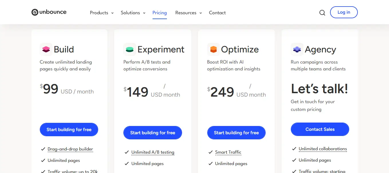 Unbounce propose une tarification mensuelle en version Standard, Optimize, Accelerate et Concierge, allant de 74 dollars à 649 dollars par mois (paiement mensuel). Le plan Optimize (109 dollars) donne accès à Smart Traffic, son principal atout. Le plan Accelerate ajoute des fonctionnalités pour des équipes plus larges.