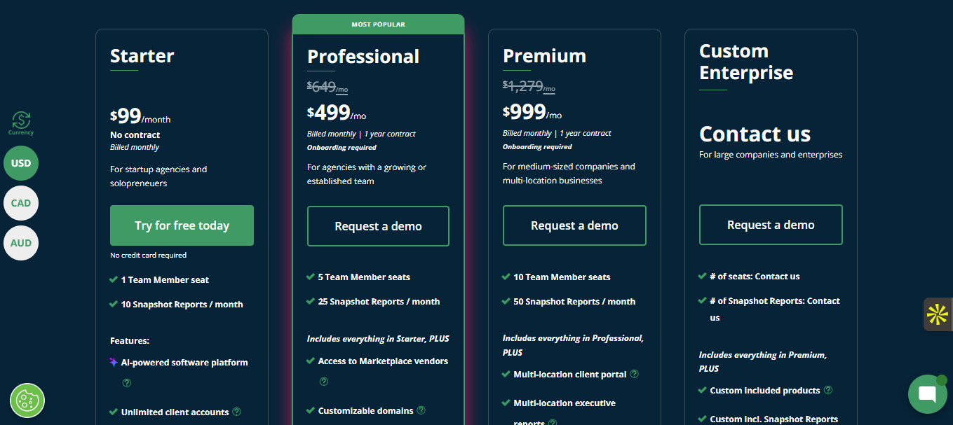 Vendasta propose une tarification sur-mesure en fonction du nombre d’utilisateurs, de clients activés et de modules nécessaires. Le site mentionne plusieurs formules allant de 99 à plus de 1 000 dollars/mois, sans grille publique complète. Des frais de setup, d’onboarding ou d’accès à certaines fonctionnalités sont parfois ajoutés.