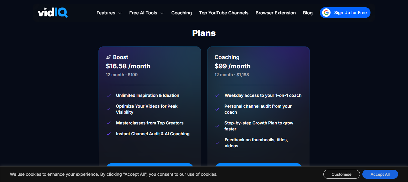 Malgré ses qualités, VidIQ comporte quelques faiblesses notables. Le plan gratuit est vite limité, rendant certaines fonctionnalités clés inaccessibles sans abonnement. Le tarif Boost+ est clairement orienté entreprise et hors de portée de nombreux créateurs.