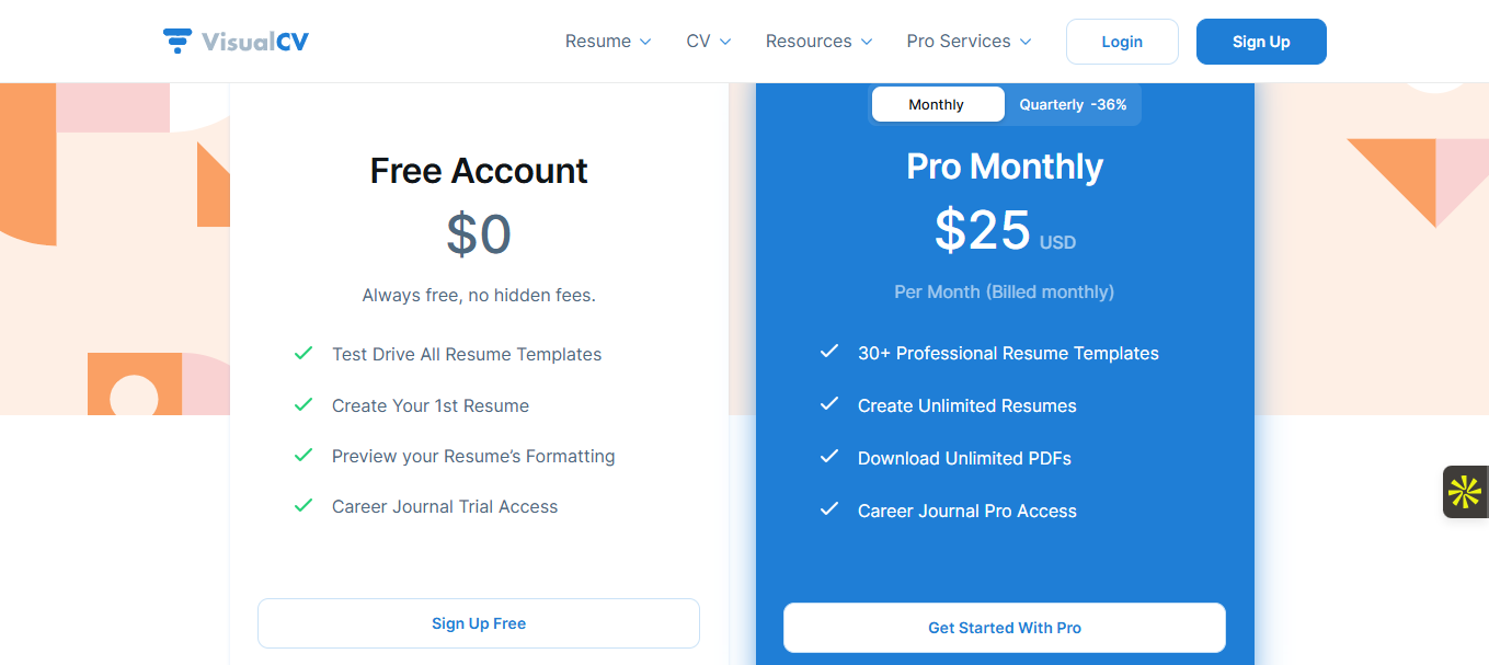 VisualCV propose un modèle freemium accessible, mais pour profiter pleinement des fonctionnalités (versions multiples, suivi, export PDF pro), le plan Pro est indispensable. Le prix est de 18 USD/mois en mensuel, ou 12 USD/mois en annuel. À ce tarif, vous accédez à tous les modèles, au suivi des vues, aux exportations avancées, au mode portfolio en ligne, etc.