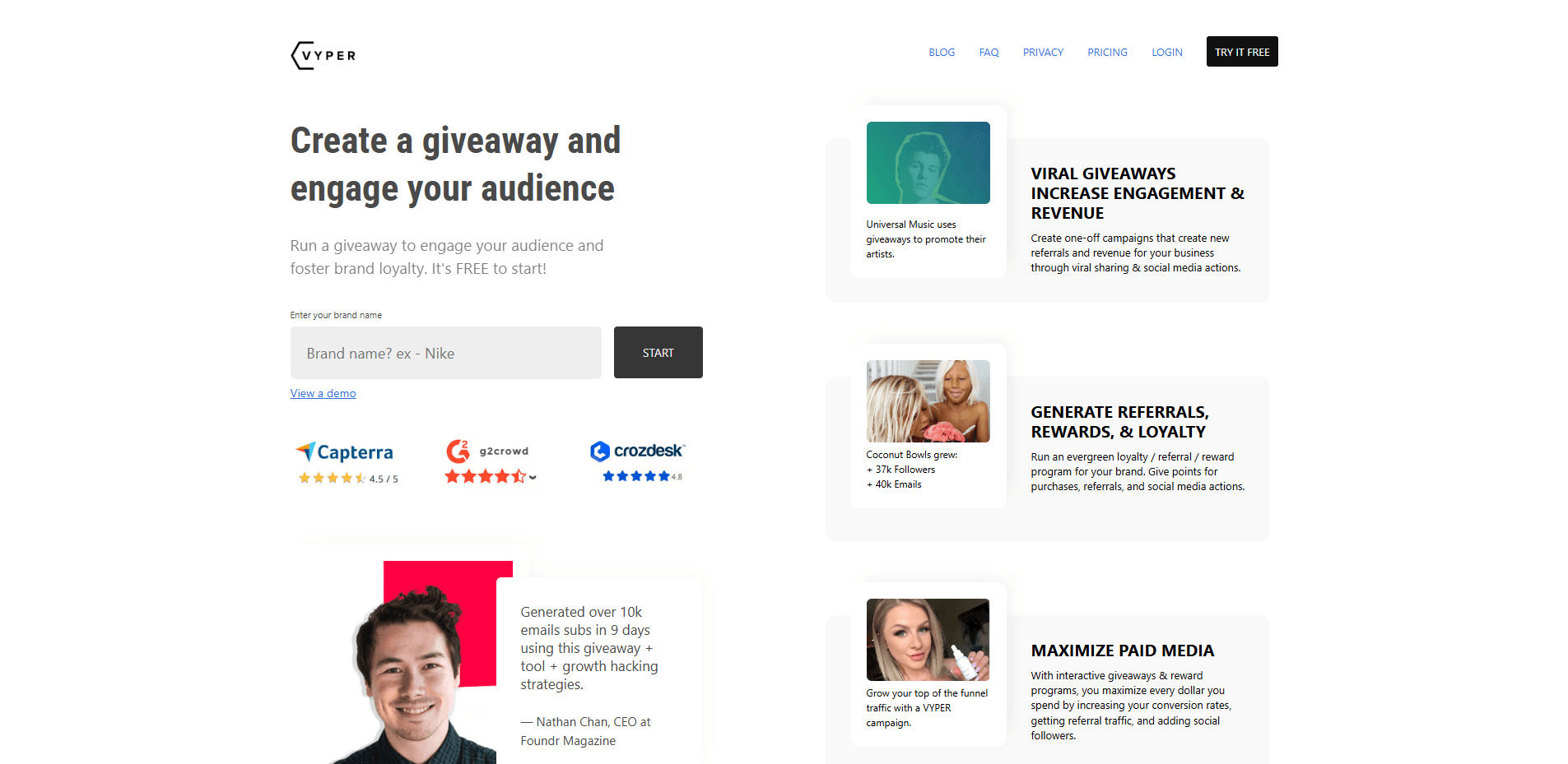 Vyper est une plateforme SaaS de marketing viral et de programmes de parrainage permettant de créer des concours, cadeaux et campagnes de fidélisation.