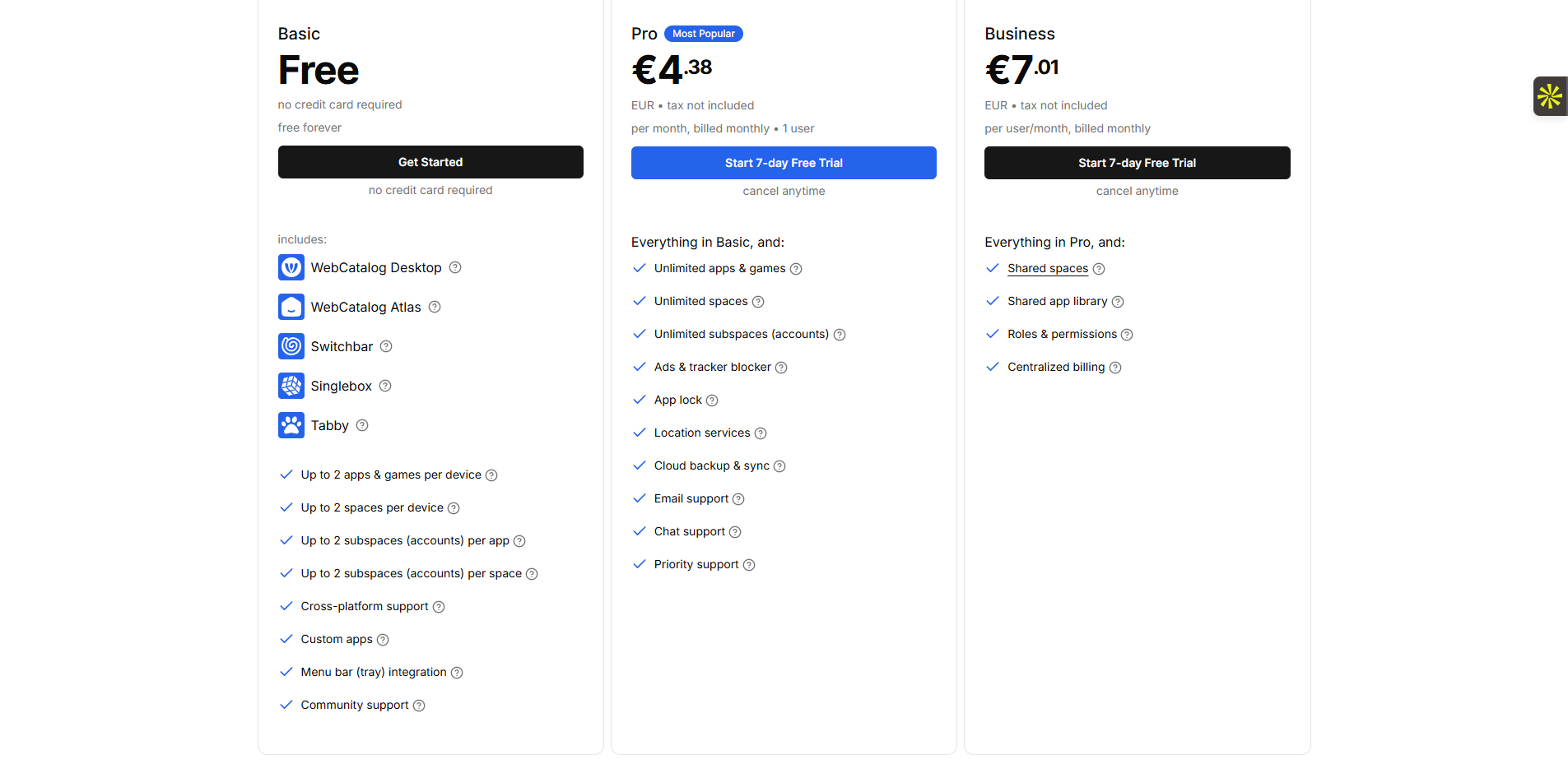 WebCatalog propose quatre niveaux tarifaires : une version gratuite, le plan Pro à 4,99 euros/mois, le plan Ultra à 9,99 euros/mois et un plan Custom pour les entreprises. La version gratuite permet déjà de créer et utiliser des apps web, mais avec des limitations fonctionnelles importantes.