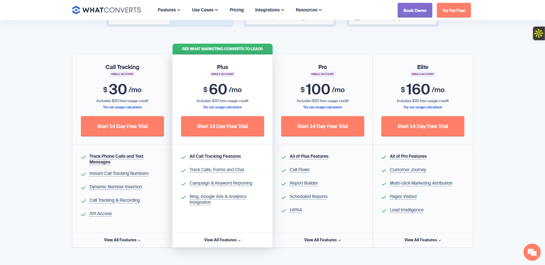 WhatConverts propose des tarifs relativement compétitifs pour ses fonctionnalités : à partir de 30 dollars/mois pour un suivi de base, jusqu’à à 100 dollars/mois ou plus pour des volumes plus élevés ou plusieurs types d’interactions. Tous les plans incluent le tracking d’appels, de sessions, de sources, avec des différences sur les volumes, les intégrations ou la profondeur des rapports.