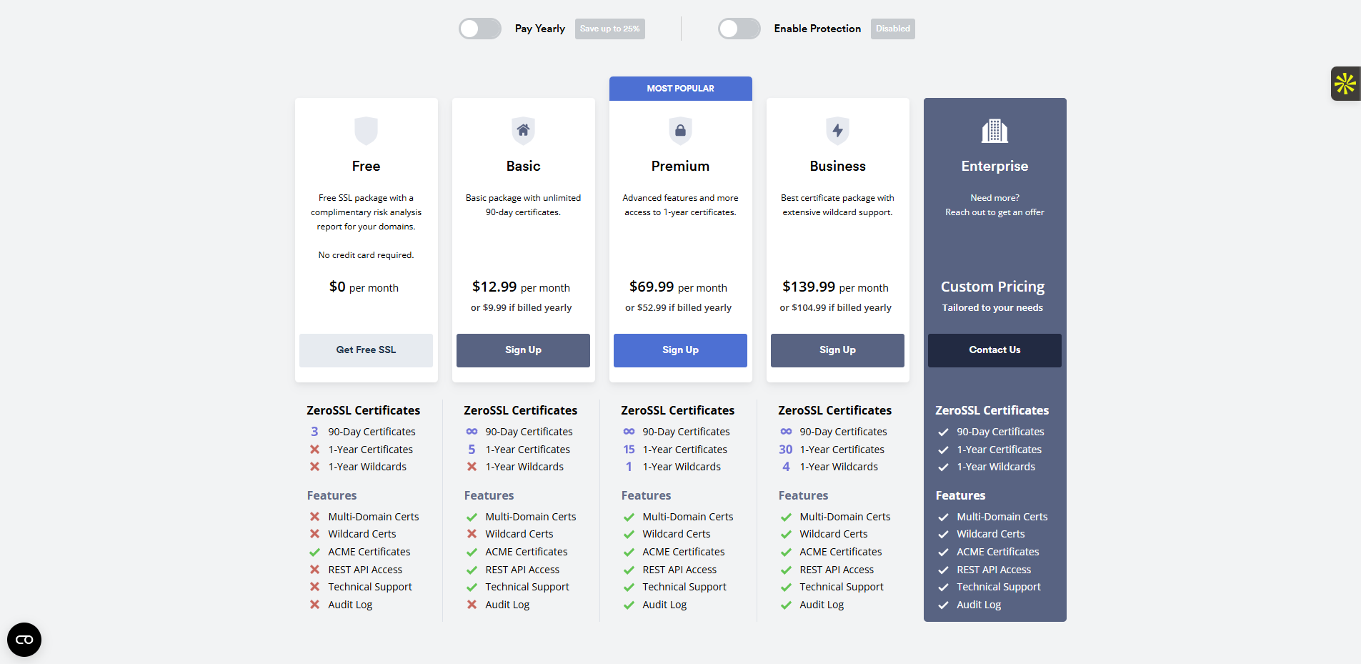 ZeroSSL propose une tarification flexible avec 4 niveaux : gratuit, Basic, Premium et Business. Dans l’offre gratuite, vous bénéficiez de jusqu’à 3 certificats SSL 90 jours renouvelables manuellement. Le plan Basic (à partir de 10 euros/mois) permet l’automatisation ACME, 5 certificats actifs, et une meilleure rétention de logs. Le plan Premium (à partir de 50 euros/mois) étend les quotas à 25 certificats, avec support prioritaire.